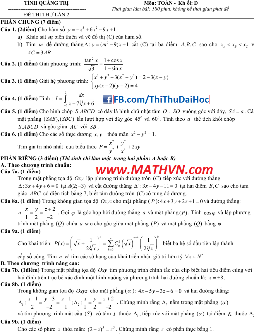 Đề bám sát cấu trúc 9 câu của Bộ; hơi khó so với sức học của các thí sinh khối D bình thường và khó hơn các đề Toán D chính thức của Bộ GD những năm gần đây.